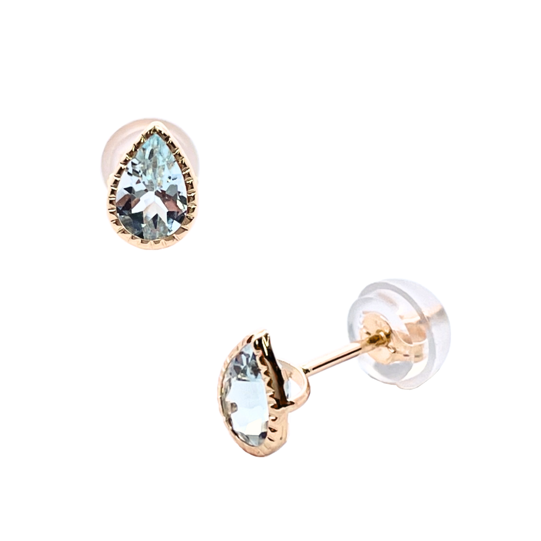 澄みきったブルーが魅力のアクアマリンを、ペアシェイプカットで仕立てたスタッドピアスです。