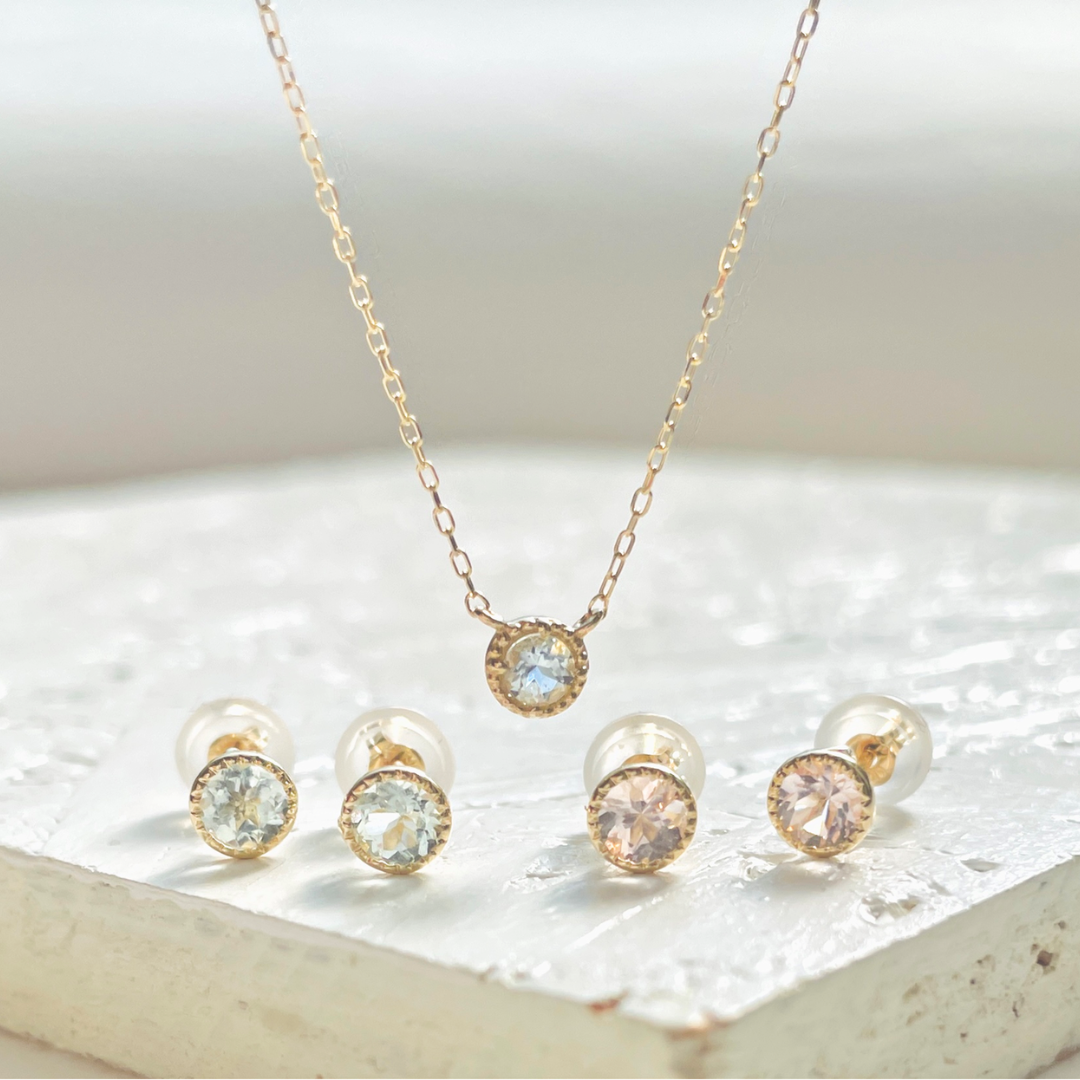 透明感あふれるアクアマリンを、繊細なミル打ちを施し、やさしく包み込んだスタッドピアスです。