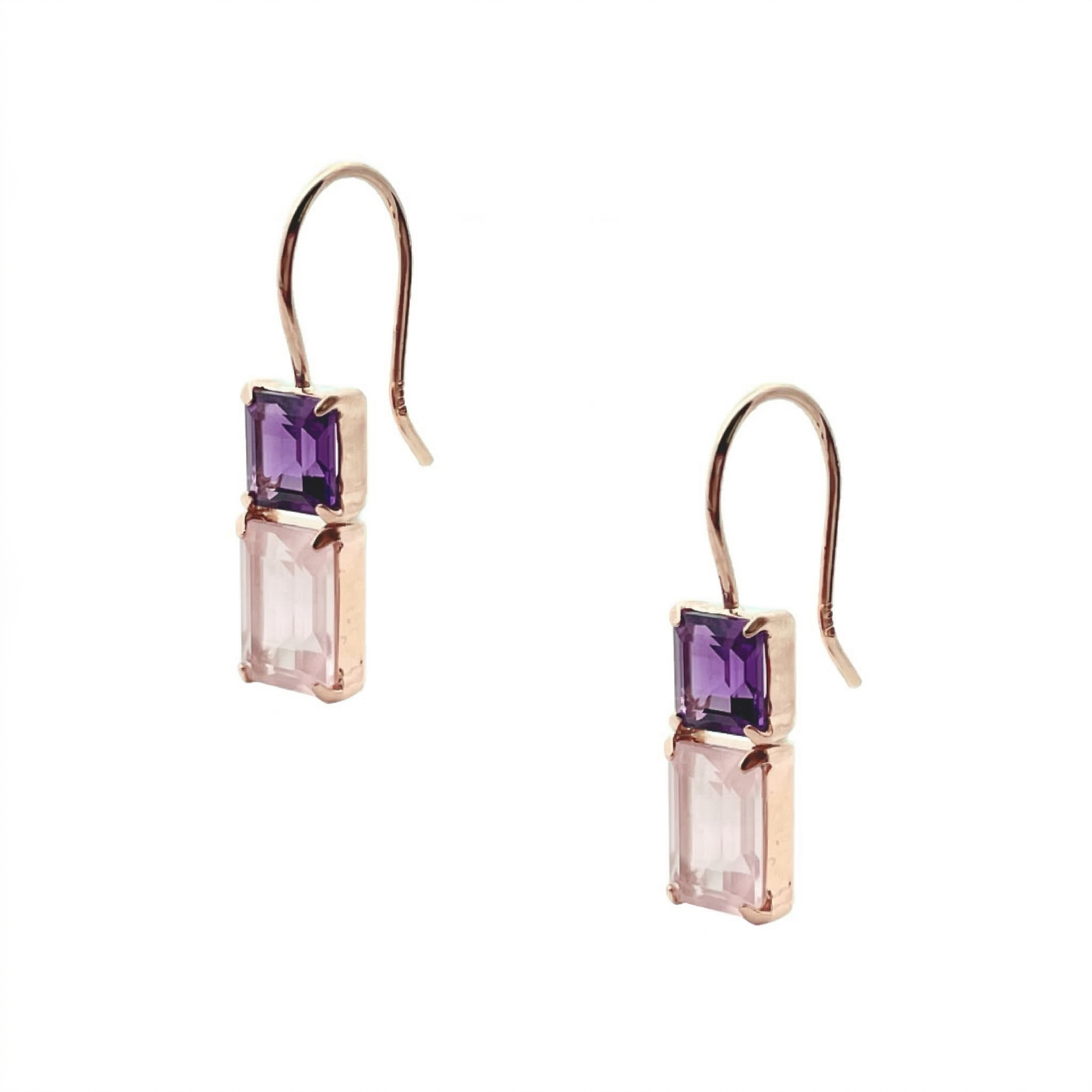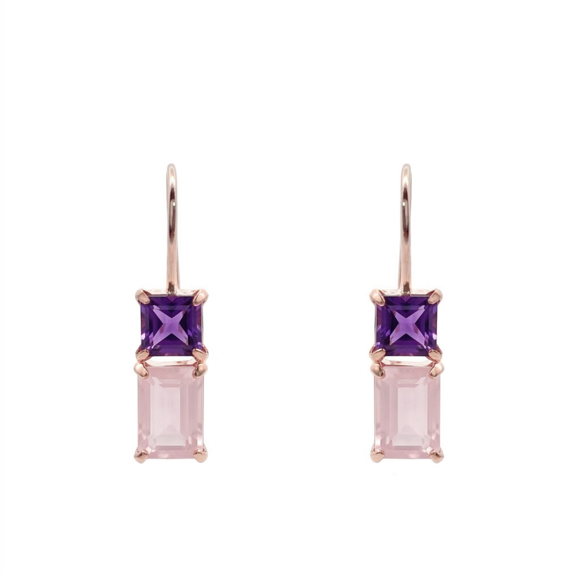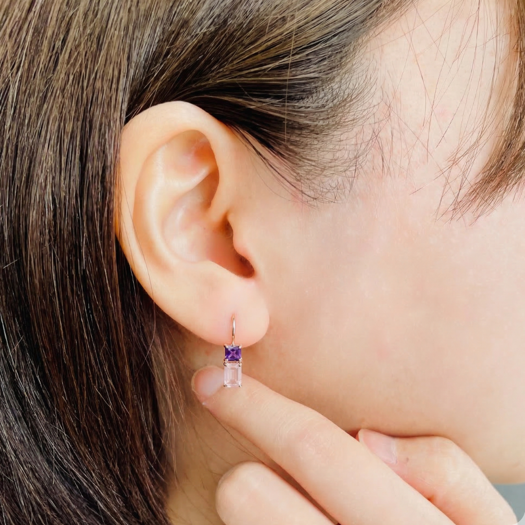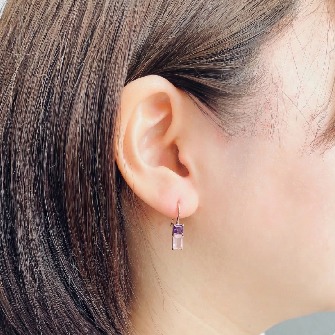 端正な印象を与えるスクエアカットのアメジストが耳元に静かな存在感を添え、その下でオクトカットのローズクォーツが揺れるたびに光を受け、やさしく可憐なニュアンスを生み出します。