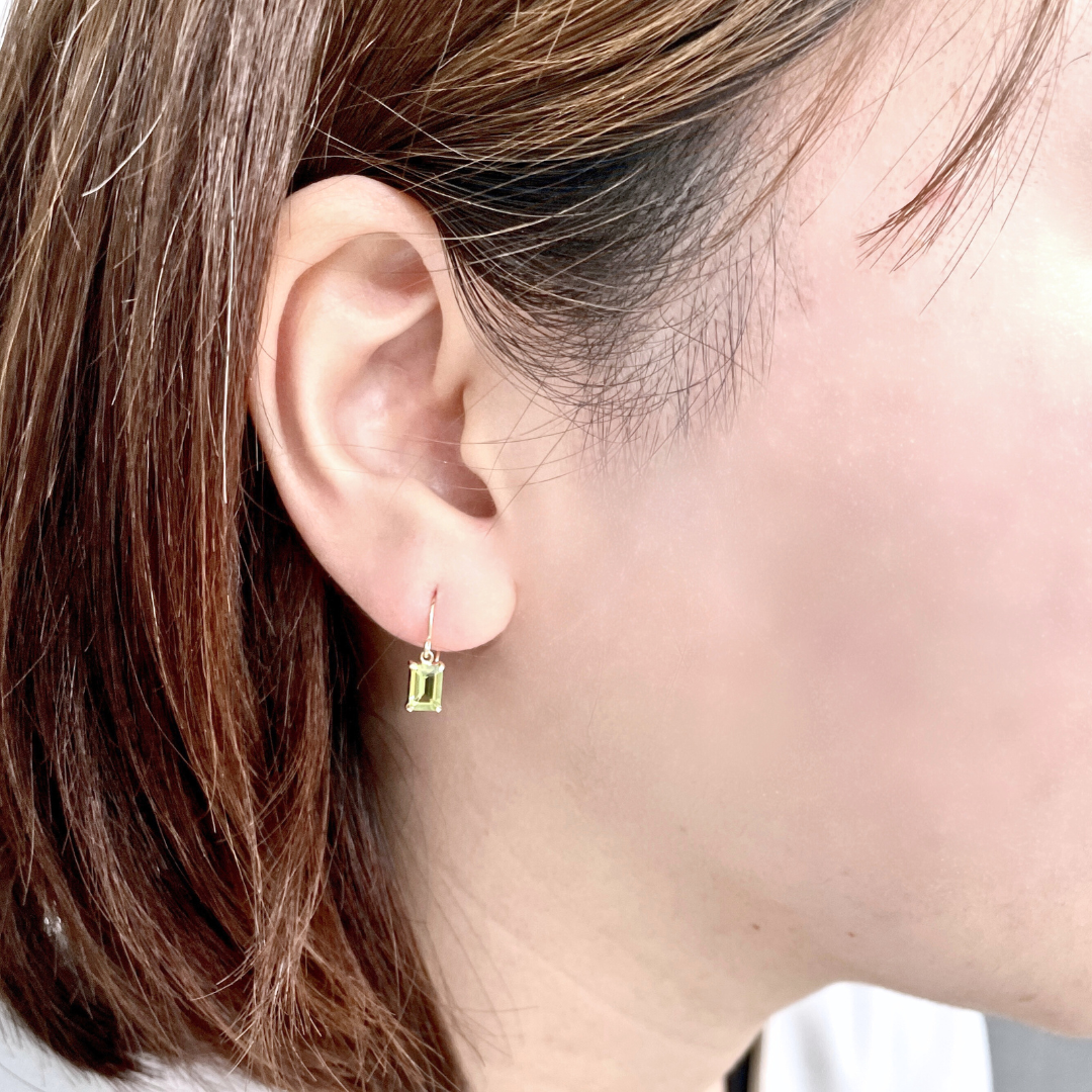透明度の高い美しいグリーンの品質が最上とされるペリドットをスクエアのカットしてシンプルの揺れるピアスに仕立てました。