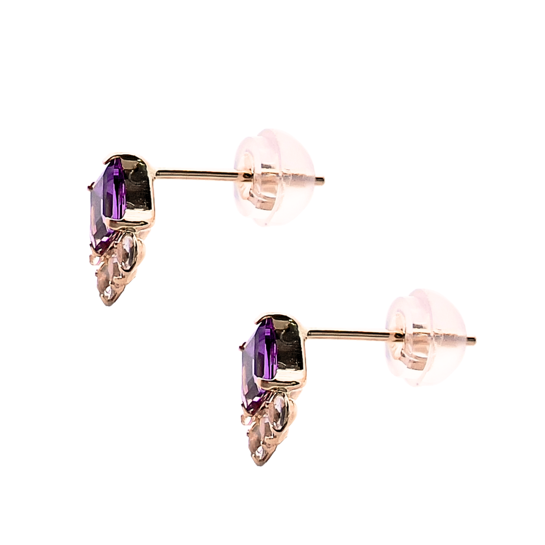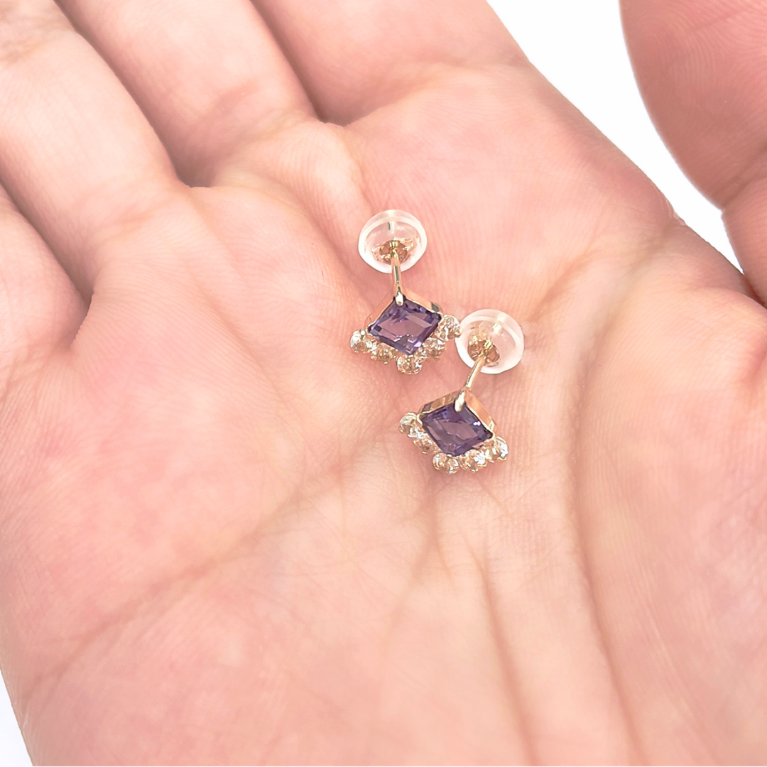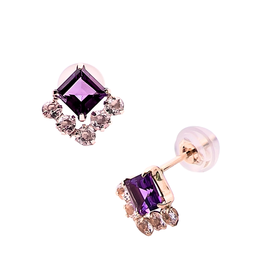 スクエアカットのアメジストに煌めくホワイトトパーズを組み合わせたスッキリとしたデザインのピアスです。