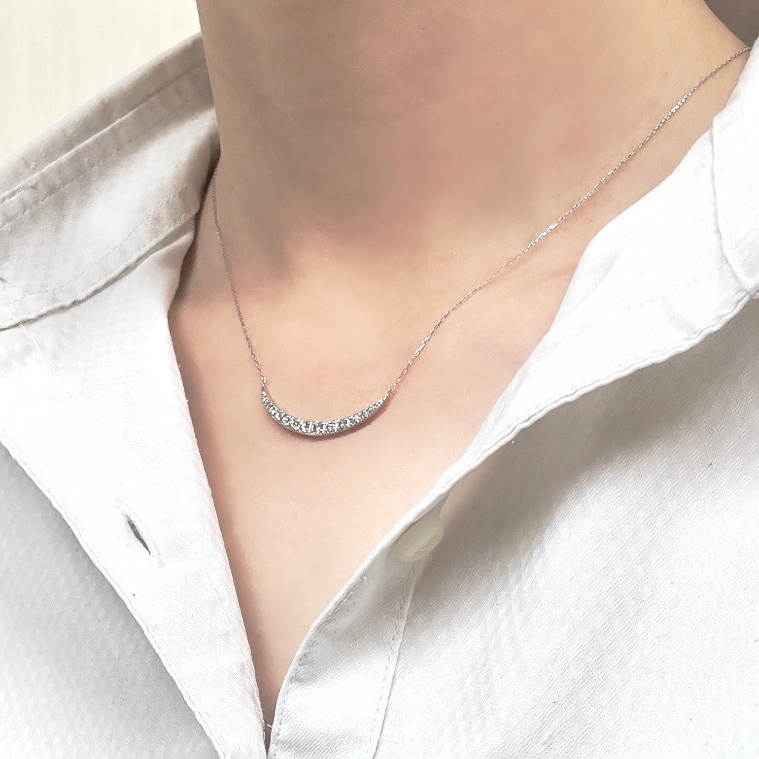 胸元に寄り添うように描いた ハーフムーンデザインのスタイリッシュなデザインネックレスです。