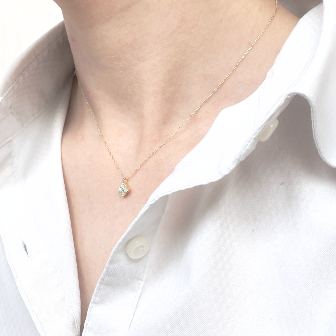 4月の誕生石 ダイヤモンドと18金の華やかなゴールドカラーのクローバーデザインは身に着ける人をクラスアップさせるジュエリーです。