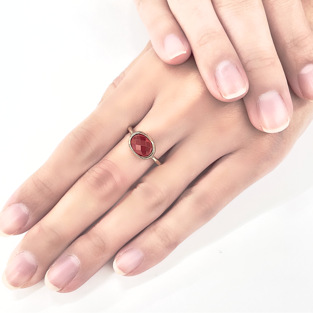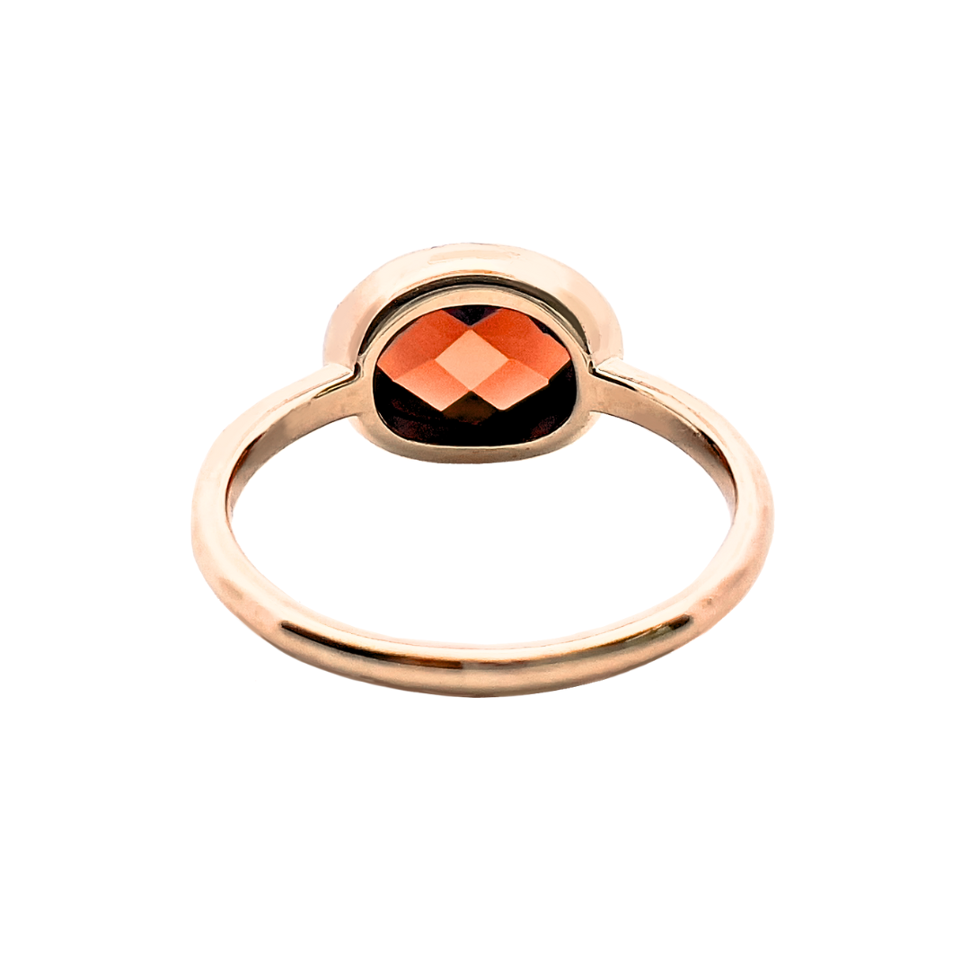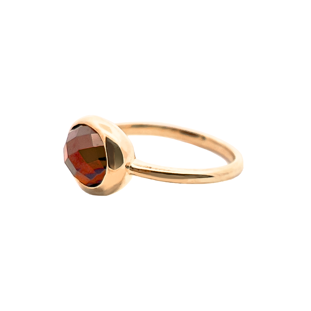 ガーネットの輝きを活かすK10イエローゴールドのシンプルなフセコミ枠は世代を問わずに楽しめるデザインです。