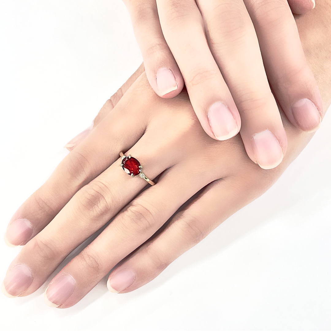 センターストーンのガーネットを引き立てるダイヤモンドの輝きがエレガントなリングです。