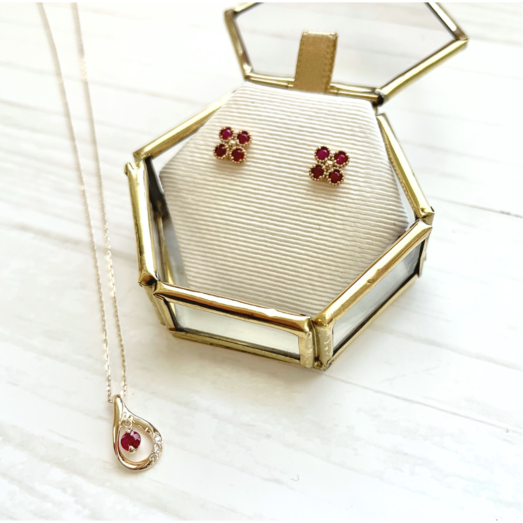 ドロップのフレームにはキラキラと輝くダイヤモンドをセッティングして7月のバースデーストーンのルビーをより美しく引き立てるようにデザインしています。
