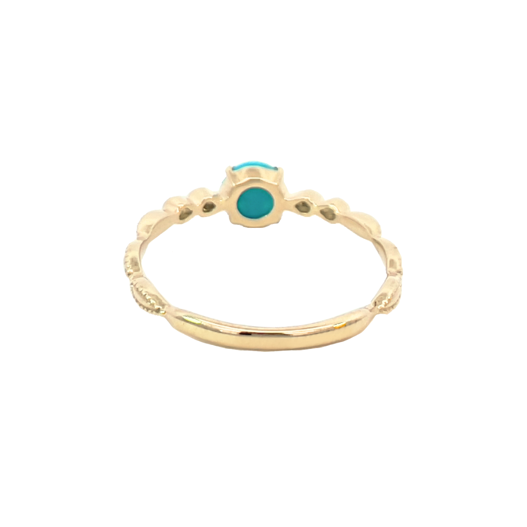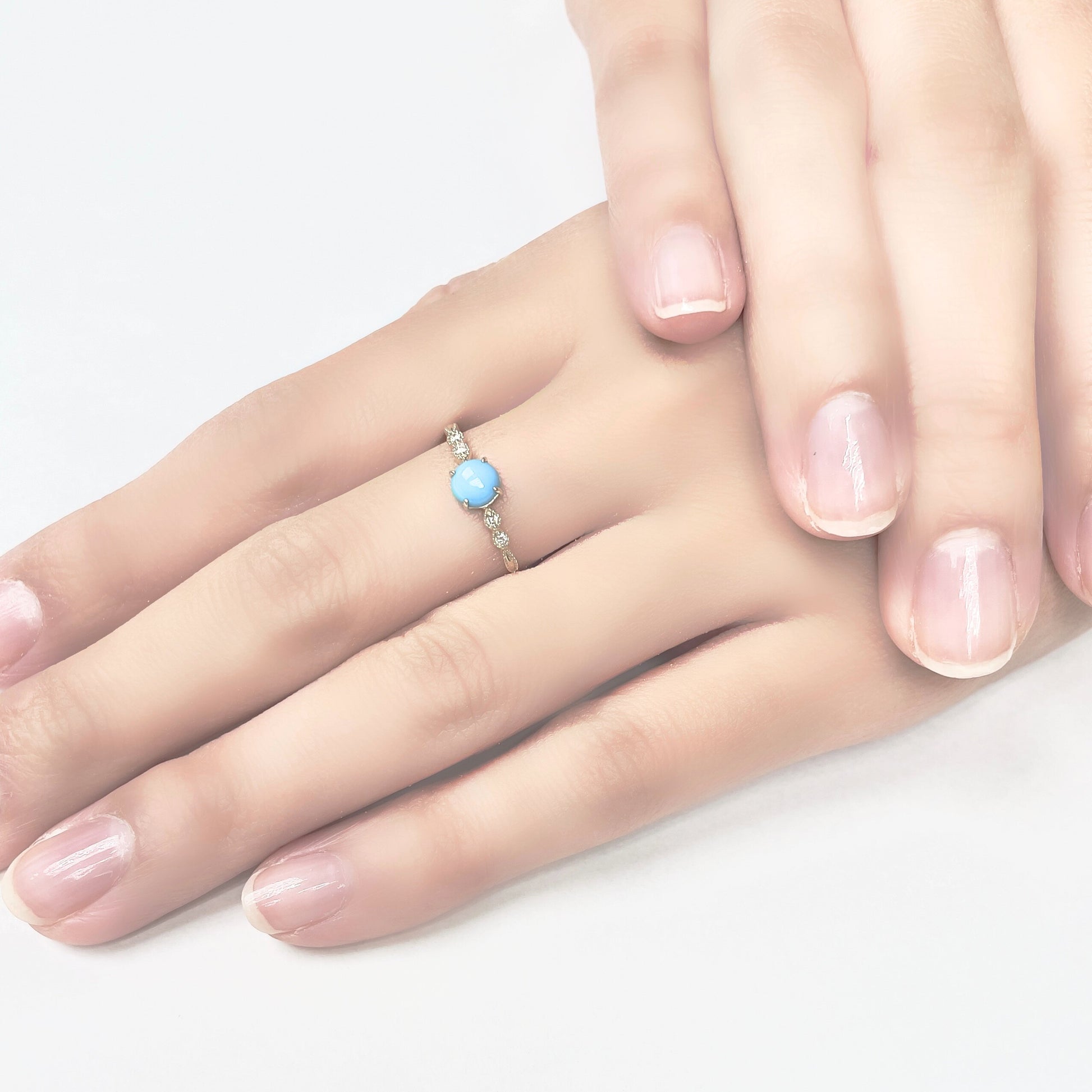 センターストーンのターコイズは優しい色合いで手元を上品に演出してくれるデザインです。